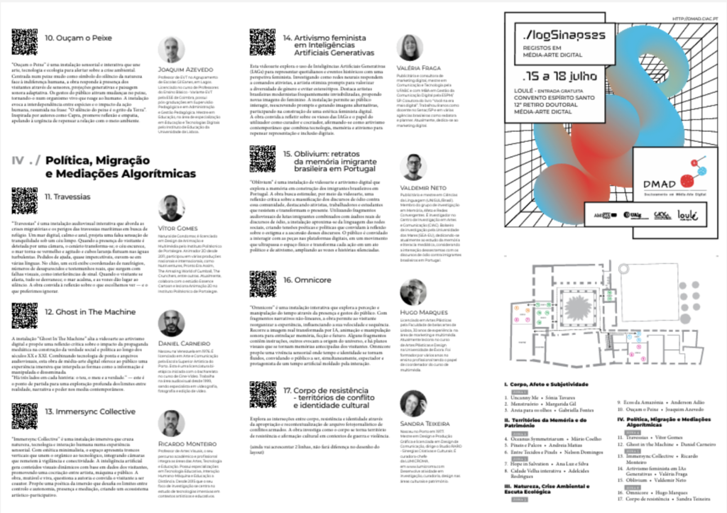 As obras apresentadas em “./logSinapses” ultrapassam o estatuto de objetos contemplativos. São experiências imersivas, interativas, muitas vezes generativas, que convocam o público a participar ativamente na construção de sentido. Utilizando a tecnologia como linguagem, e não apenas como meio, os artistas-investigadores exploram temas urgentes — identidade, memória, política, ecologia, mediação — através de práticas que interligam o físico e o digital, o real e o virtual.