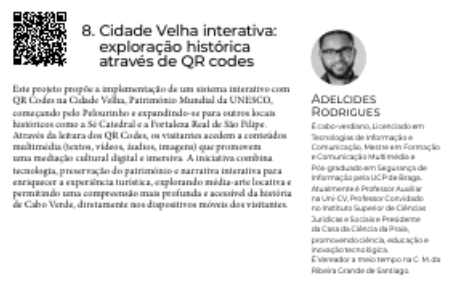 O presente projeto propõe a implementação de um sistema interativo baseado em QR Codes na Cidade Velha, classificada como Património Mundial pela UNESCO, com o objetivo de proporcionar aos visitantes uma experiência digital imersiva, educativa e acessível. Parte-se do pressuposto de que a valorização do património histórico-cultural pode — e deve — incorporar as potencialidades da média-arte locativa e da narrativa digital interativa enquanto ferramentas de mediação cultural no contexto contemporâneo.